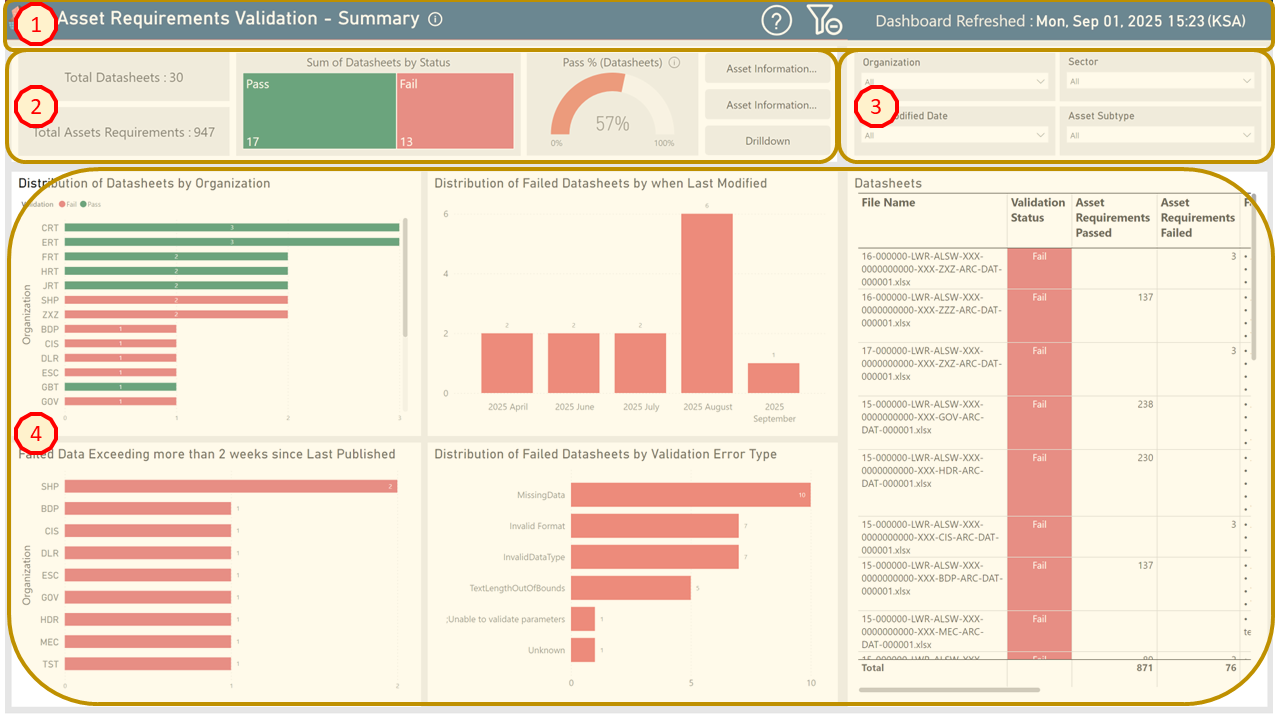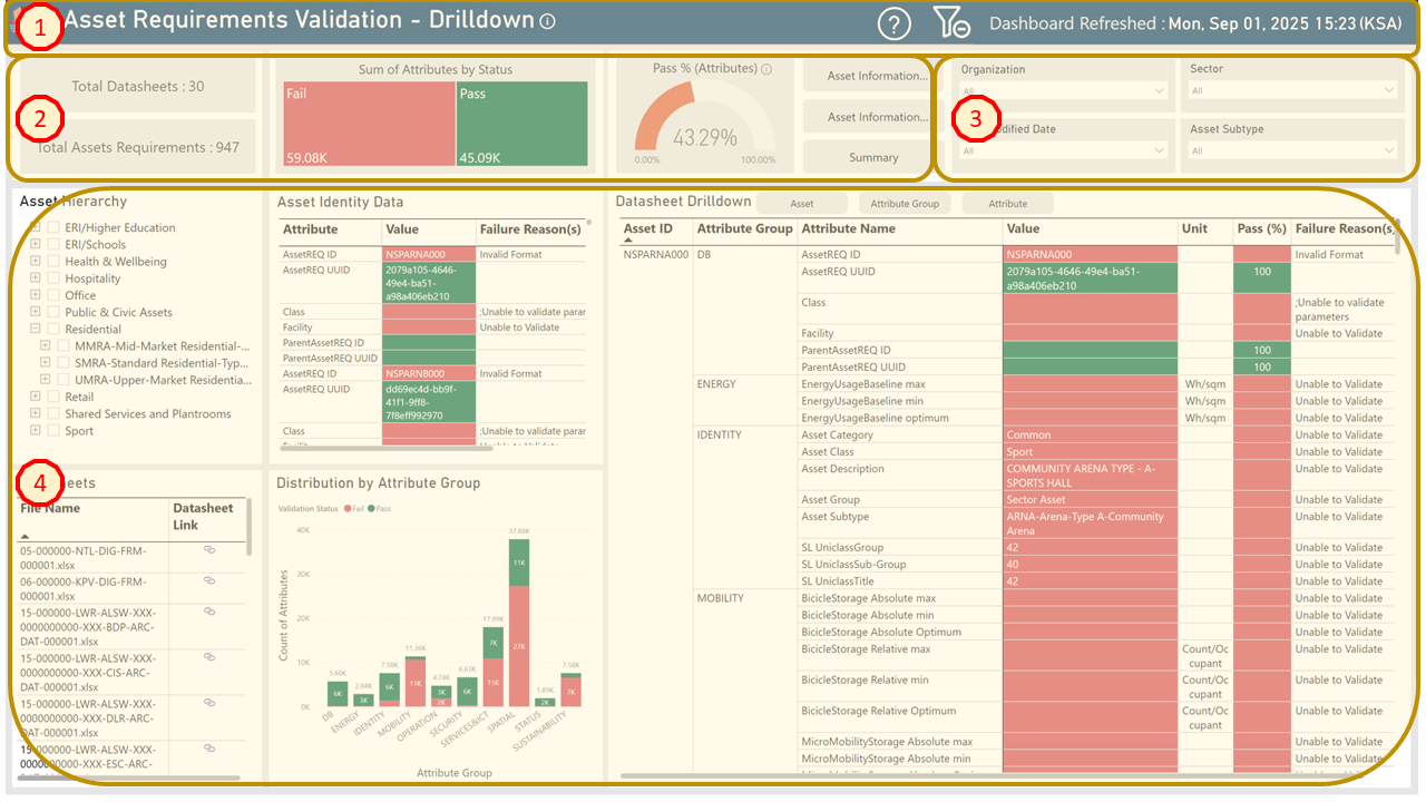 - Drilldown Dashboard - This is a detailed view across all attributes in submitted datasheets and provides additional grouping features. For example, it provides an analysis of the number of attributes contained within assets and whether such attributes have passed or failed against their specific requirements.
